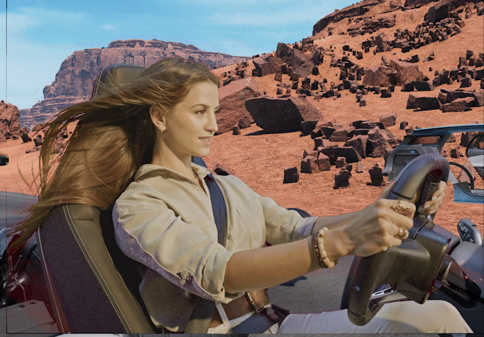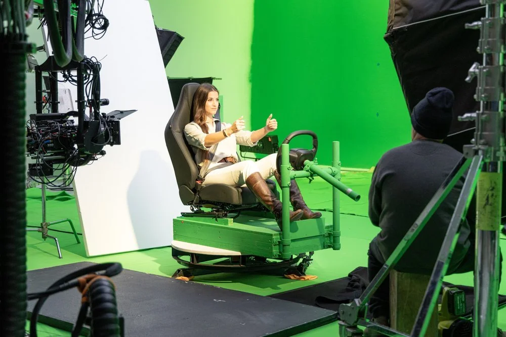 There was a slate of shoot days lined up for the overall vehicle launch keynote and within that timeframe there was about a day allocated to capturing Lexie on a green screen for our portion of the film. Our team provided on-set VFX Supervision during the shoot and worked in pre-production to advise on what touch points we needed to capture for Lexi. We, ultimately, ended with her sitting in a physical seat and reaching out to touch a propped up steering wheel as our base footage to work from. We then took the raw footage and camera data from the shoot day and began the next steps of the process to integrate with CGI.