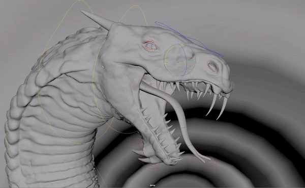 Two different rigs were created with the model: one very quick rig to start our previs stage; the other much more detailed rig that controls every possible movement to create realistic movement to the mouth, neck and scales.