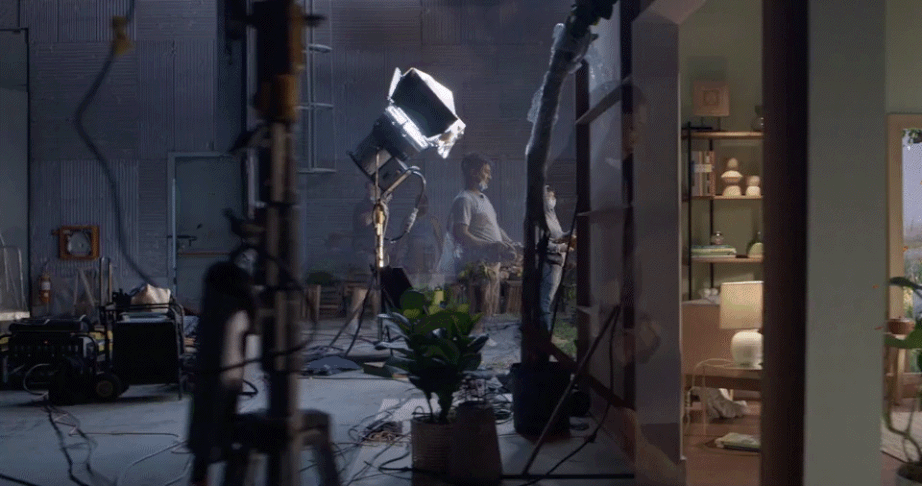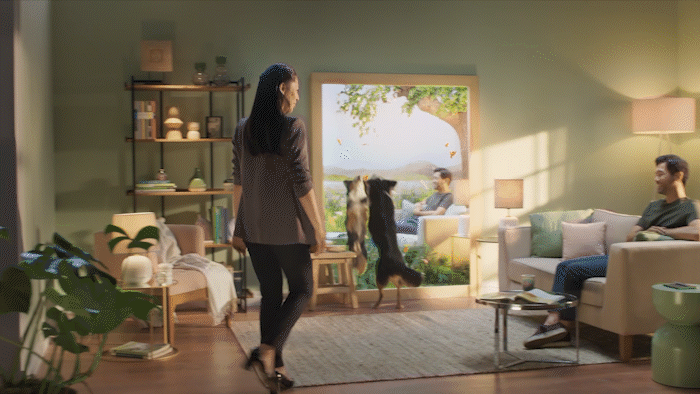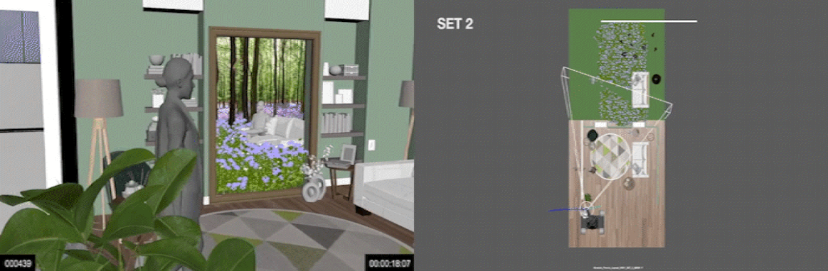 The mirror's "reflection" is actually another set behind the wall. The living room is transformed into a beautiful wildflower field. Takes of the hero talent walking to the sofa were mimicked to be repeated on the 'nature side' of the set. Adding the dog into the choreography was a challenge, but after many takes we were able to get it all in one moment.