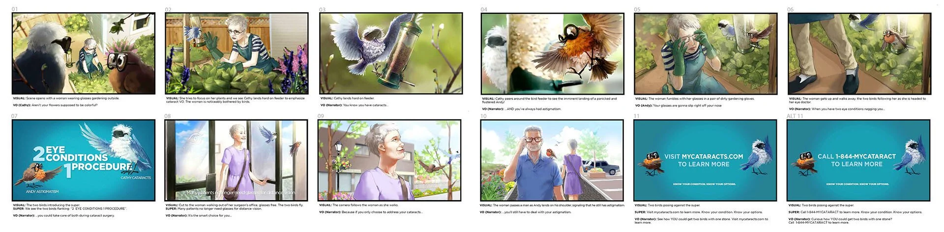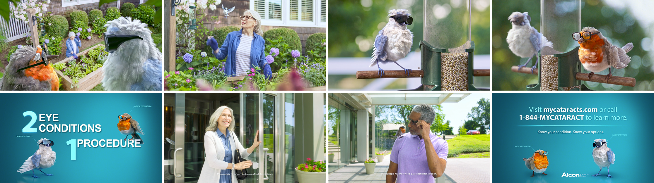 We teamed up with H4B and Alcon to produce a campaign promoting the benefits of a surgical option that addresses both cataracts and astigmatism. We created a 30 second spot that was adapted for print and cinemagraphs - delivering three executions with one production pipeline. The spot required extensive character concepting and integrating live action with CG birds.