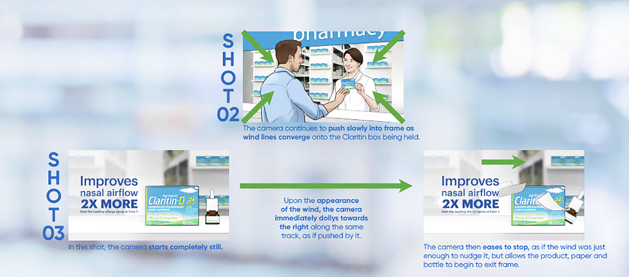 Utilizing CG, we produced a variety of elements for the end card and also for the shots themselves to supplement the wind elements and amplify the sense of decongestant. We had our VFX supervisor on set to capture HDRIs, shot and camera information and general lighting so we could match our CG elements to the interior and exterior shots as closely as possible.
