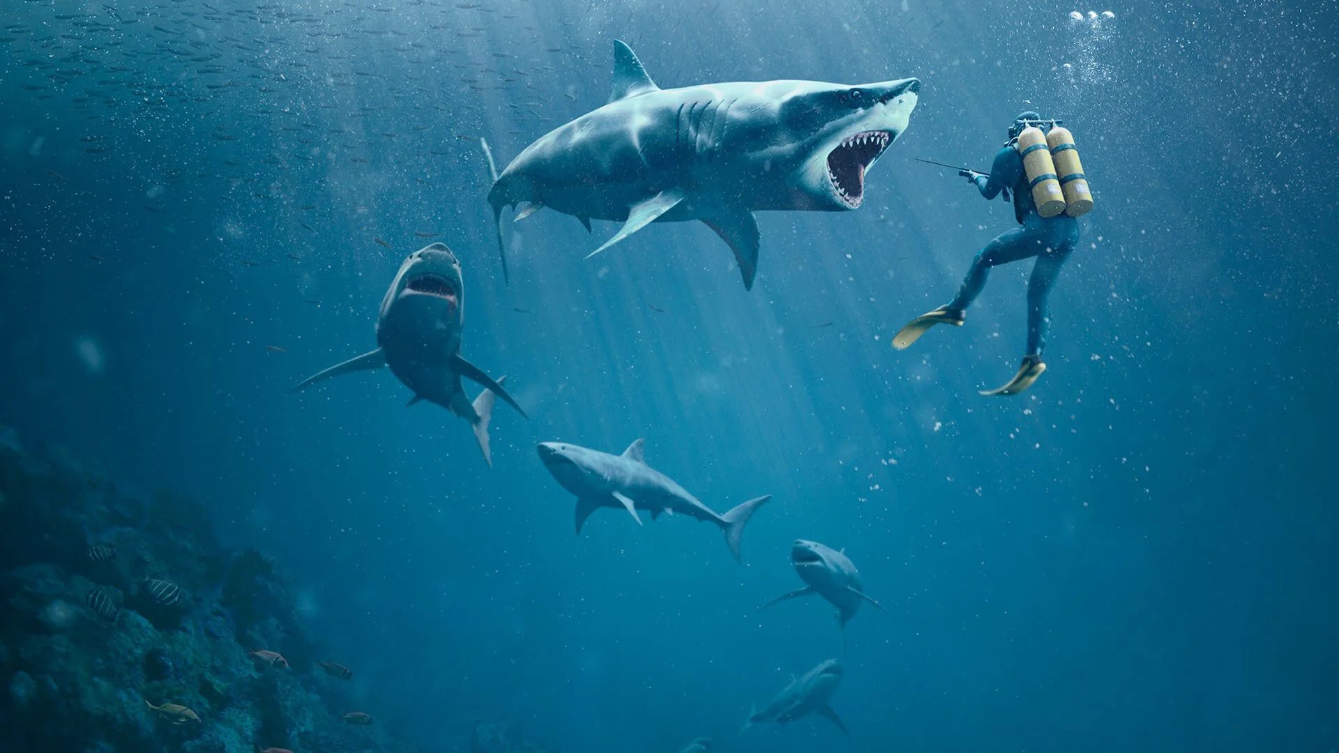 The environments, scuba diver, and animals were addressed in CG. During this final post phase, the team played around with posing, lighting, texturing, and shading of two very fierce animals in aquatic environments. The positioning of the animals needed to show a continual threat. Not hard to do with crocodiles and sharks!