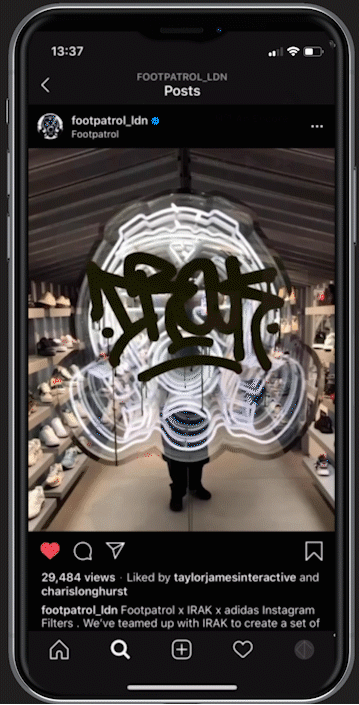 The Taylor James Interactive team and Footpatrol London worked on a series of social media filters for the new Adidas IRAK A-ZX series trainer, based on designs from the NYC based collective of graffiti artists.