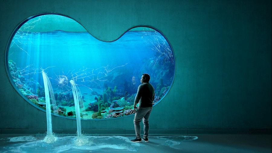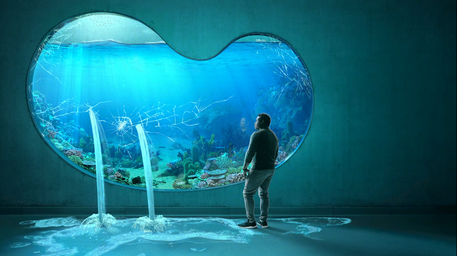 In the ad, a kidney-shaped aquarium leaks from a crack in the glass. Using Tyflow, we created four second cinemagraph loops of the water splashing onto the floor. With added movement on the other side of the glass -- rolling waves, dancing sunlight, and waving sea life vegetation — stress and realism is heightened.