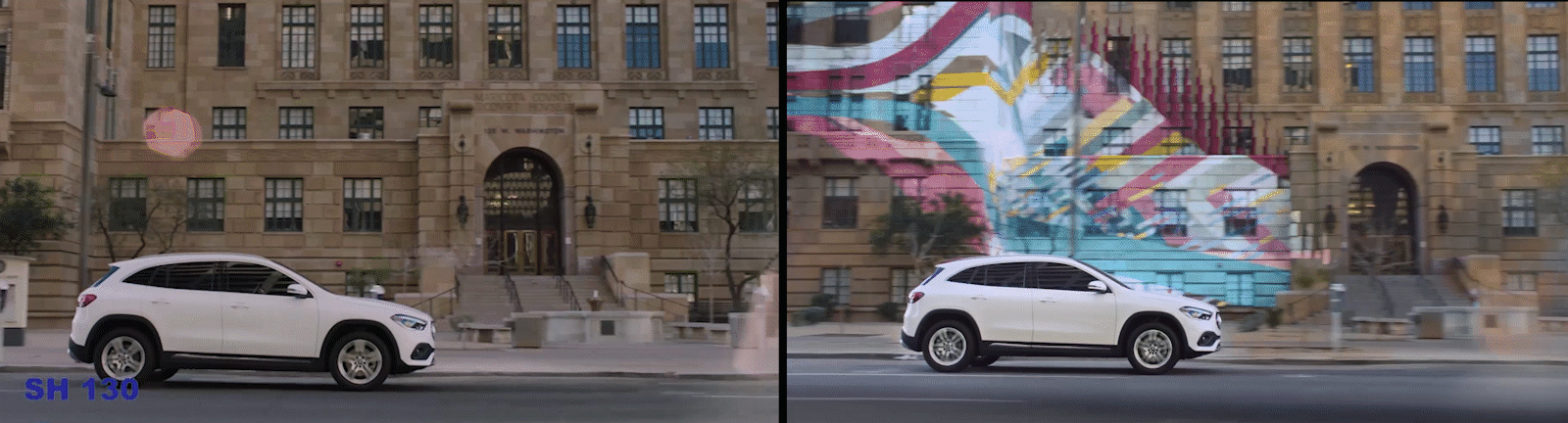 We focused on angles and camera moves that highlight and accentuate the sporty styling of the new 2021 GLA. For the exterior shots, we utilized existing GLA running footage as a foundation to build our world from. The background was augmented, with a mix of CGI and VFX techniques. The world around the car transforms to show the exciting new life that the GLA creates. Buildings transform from boring grey to vibrant, animated colors. Different shots showcase a variety of murals that shift as the car travels throughout the city.
