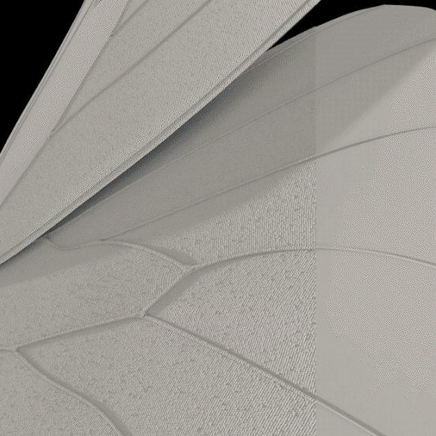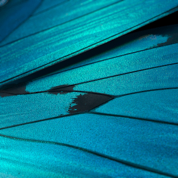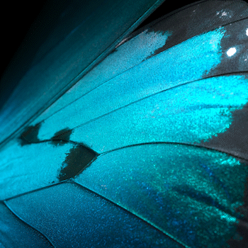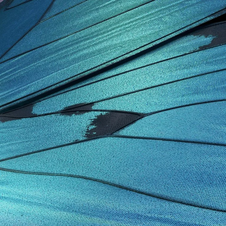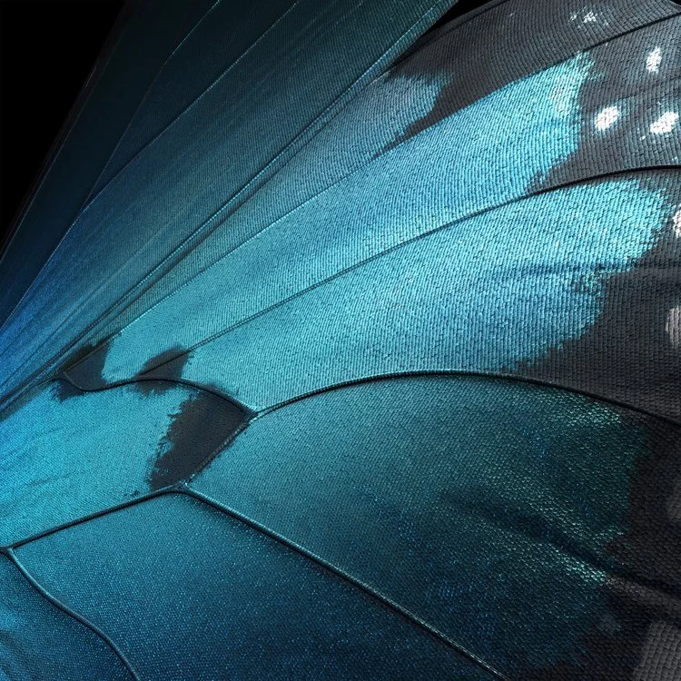 The cellular transformation of the metamorphosis process is impressive by itself, but the microscopic complexity of the butterfly’s wing is altogether mind-blowing. The wings of a blue Morpho butterfly are formed of up to a million tiny overlapping scales, arranged in a diamond pattern and appear as the most vivid blue colour in nature, and yet they contain no blue pigment. In fact, it's the micro structures of the scales that cancels out specific wavelengths, reflecting and intensifying only the blue frequencies of light. The wings themselves are very thin and soft and react more like silk fabric stretched out across a tiny framework of nerves. It's this fabric quality that allows the wings to bend and fold, and even has creases in places!