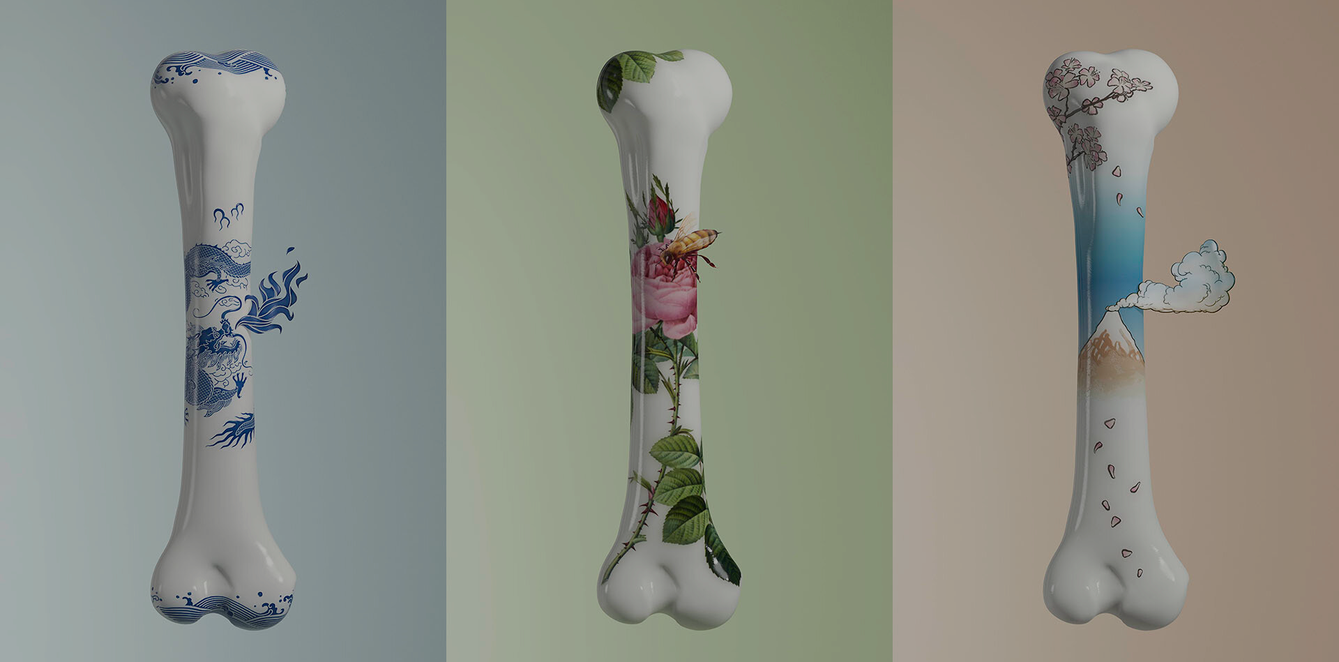Next, we mocked up the designs onto low poly CGI bones to explore various materials and textures on the bone surface. Once the client agreed on the direction, we progressed to the hi-res stage by hand drawing the illustrations. The drawings were then placed onto our 3D bone, peeling away from it. We ensured the perspective, lighting and shadows reacted realistically by mapping the illustrations and stock imagery onto the bones in 3D. We then applied the porcelain varnish onto the illustrations for a credible and consistent finish. The colored background allowed for the creation of a photorealistic reflection on the porcelain bones.