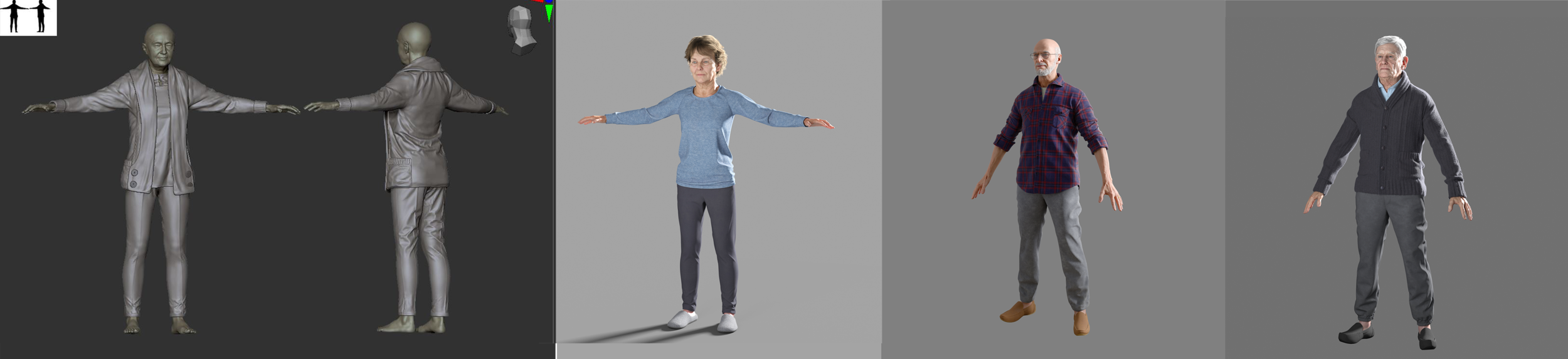 Over the course of the Covid-19 pandemic, we have become increasingly familiar with the concept of "digital doubles." A growing number of online libraries exist for a 360-degree scan of hundreds of diverse people. Photogrammetry allows for an incredibly detailed scan, which we are able to use in our own 3D software to position and pose the "talent."