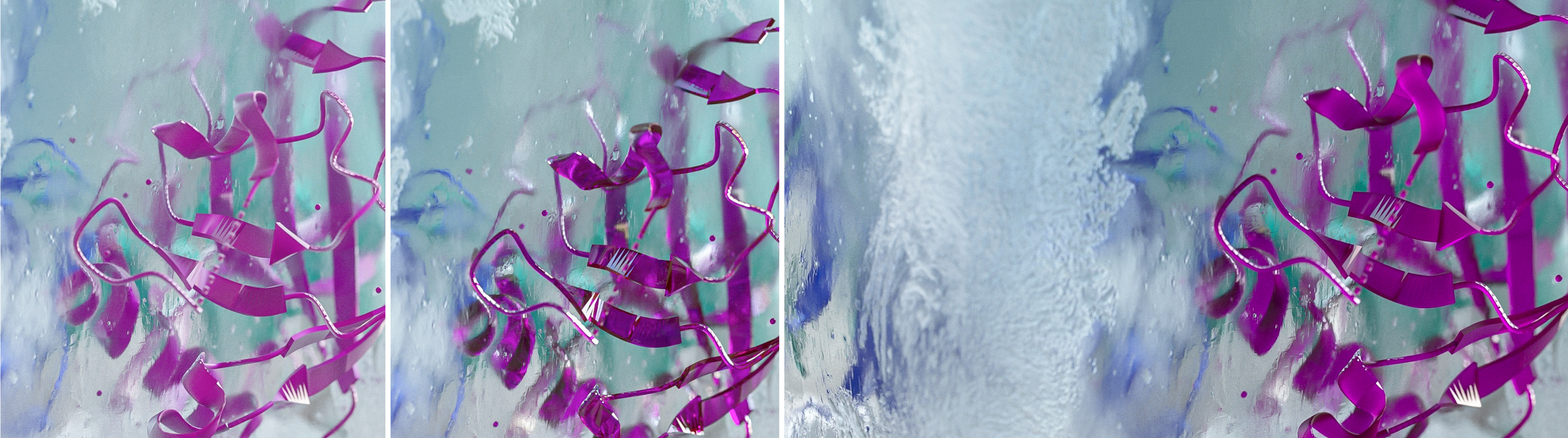 Ice played the role of a supportive actor, serving functions from containing the proteins to framing the space. Our approach entailed studying its properties using photo references and developing a CGI version through multiple iterations that allowed us to stage the cave and frame the story. Working in 3D afforded us incredible latitude to showcase different stages of the ice, ranging from completely frosted to crystal clear. This guided the viewer’s attention toward the discovery of the proteins.