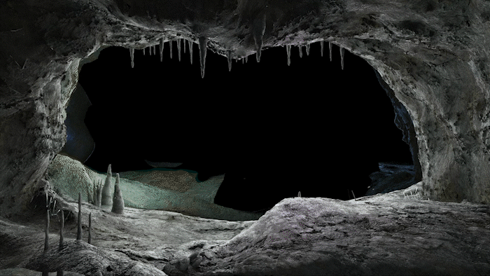 We were approached with a cinematic and creative brief that sparked a path of research and development, revealing innumerable possibilities for the execution of the concept. Our excitement to bring it to life was palpable. The caves emerged as the initial ingredient of the story, providing the perfect setup. We approached the development of the cave with a cinematic scale, drawing references from real ice caves in Iceland and concept art from sci-fi movies.
