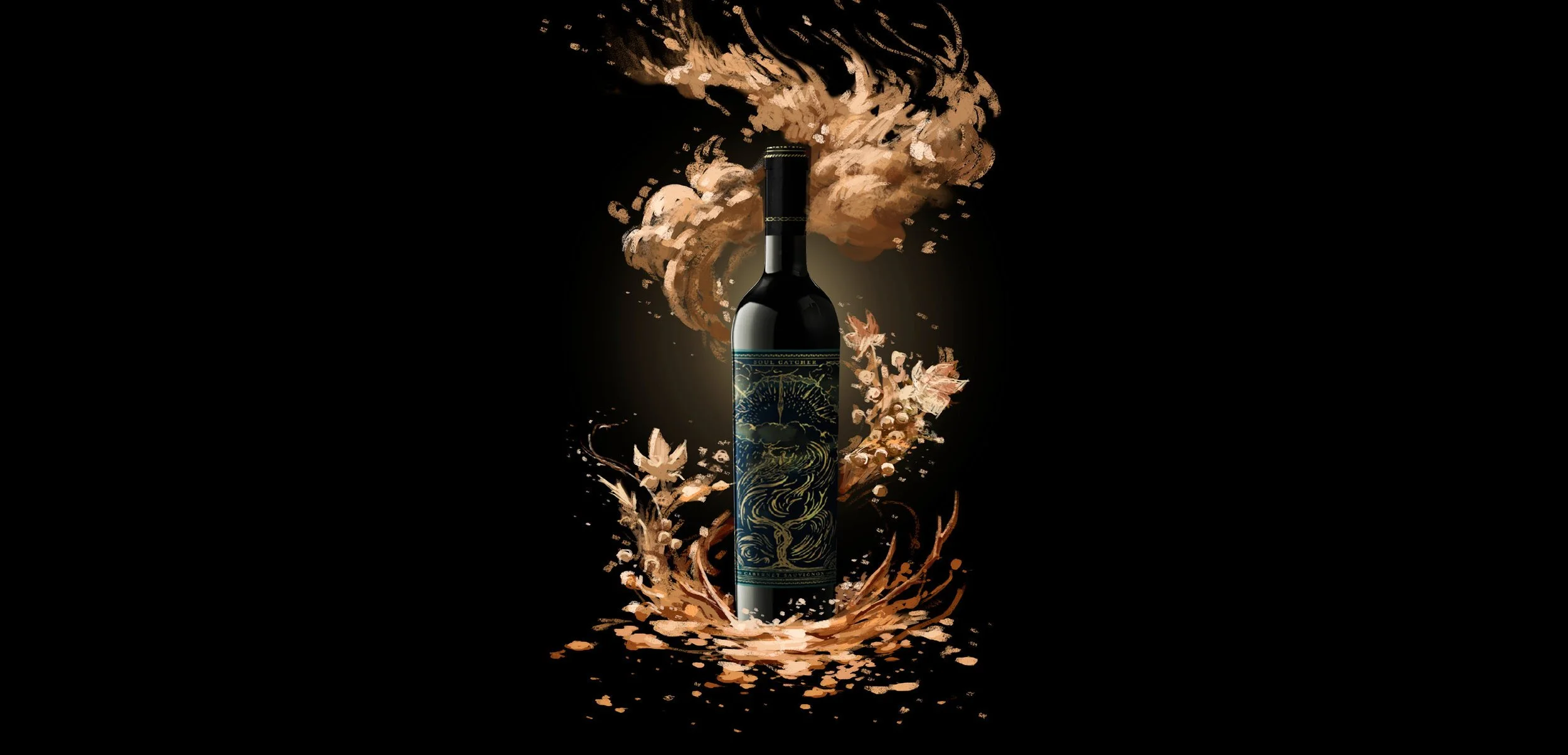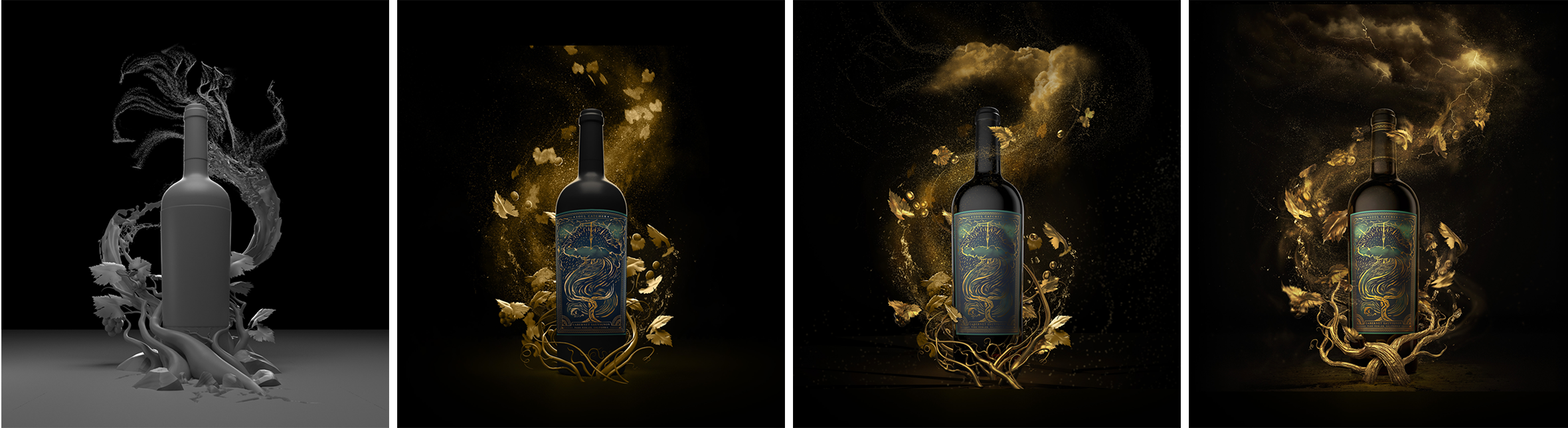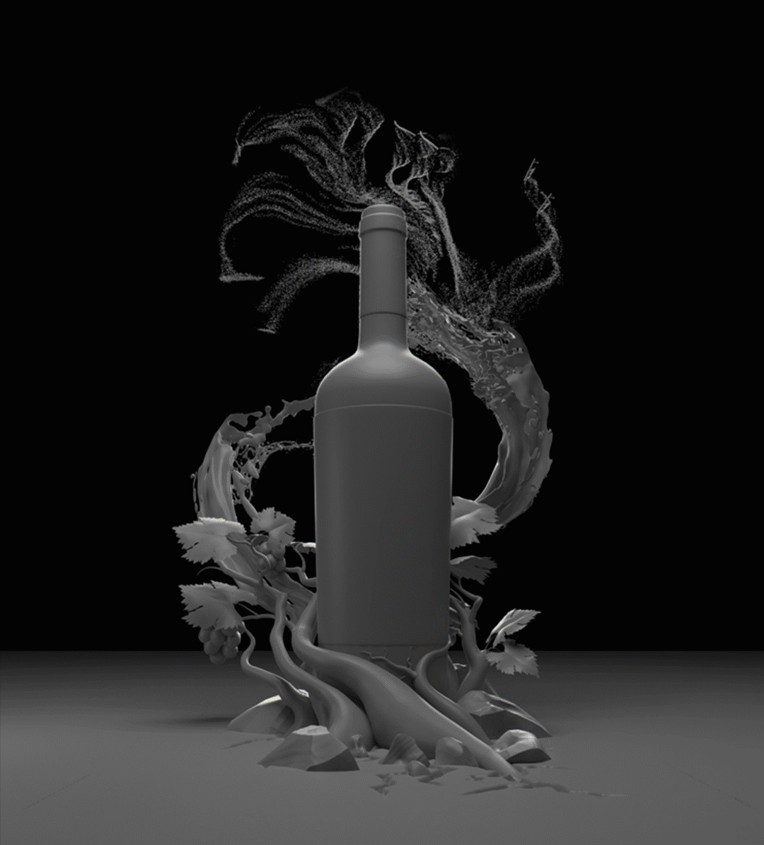 The image is almost entirely CGI, but blends with stock photography for the clouds and lighting. We used classic modelling for the bottle, ground surface, vine and leaves, and created CGI particle and liquid simulations to bring the artwork to life.