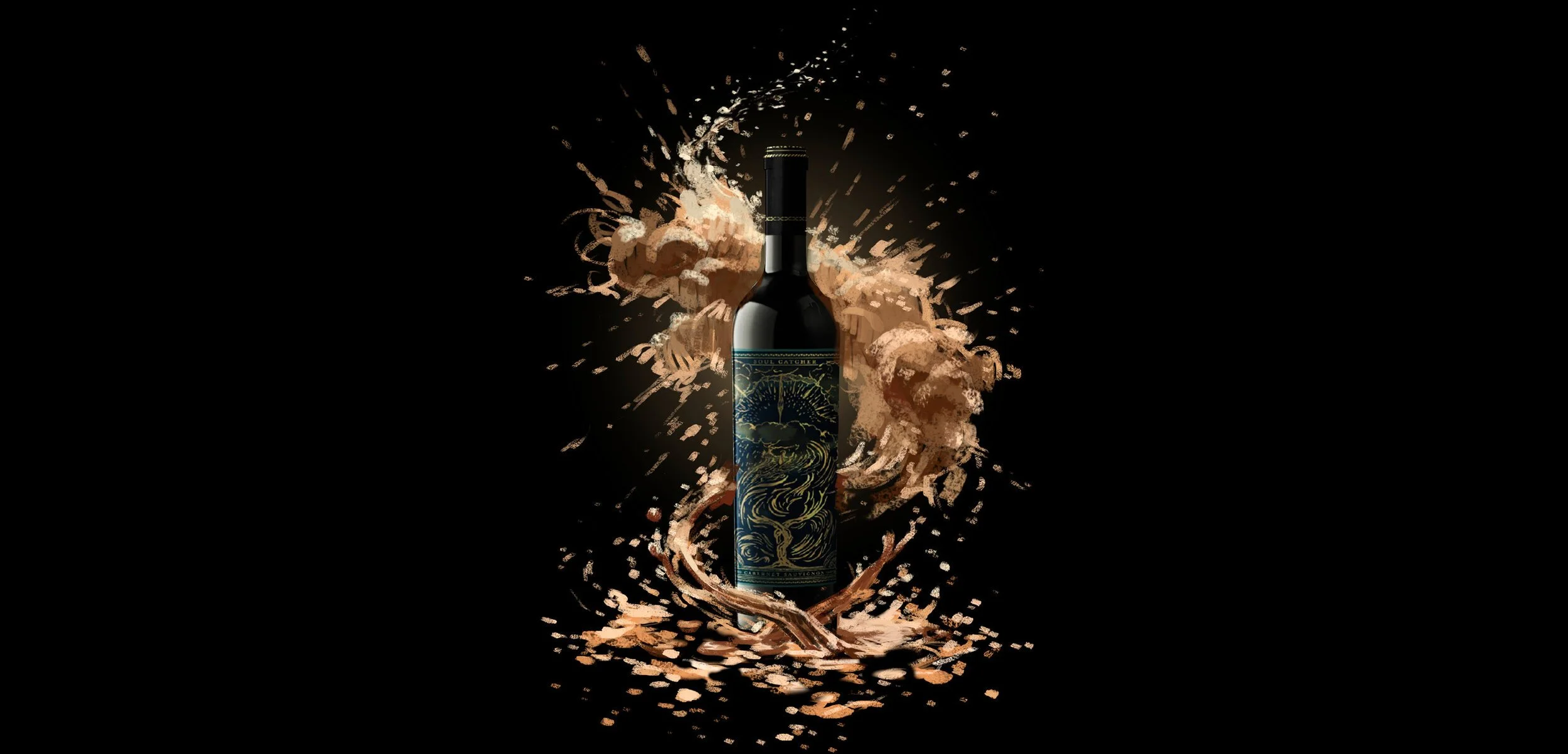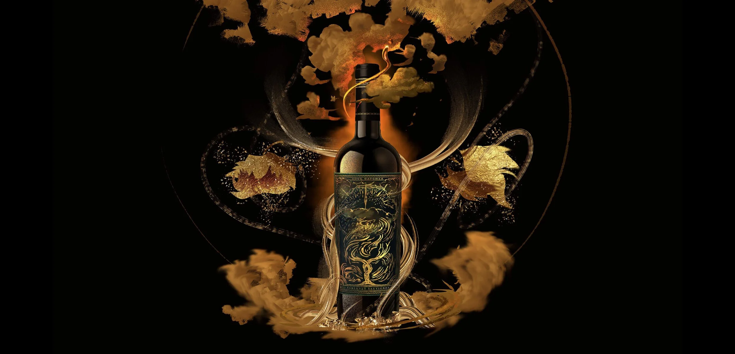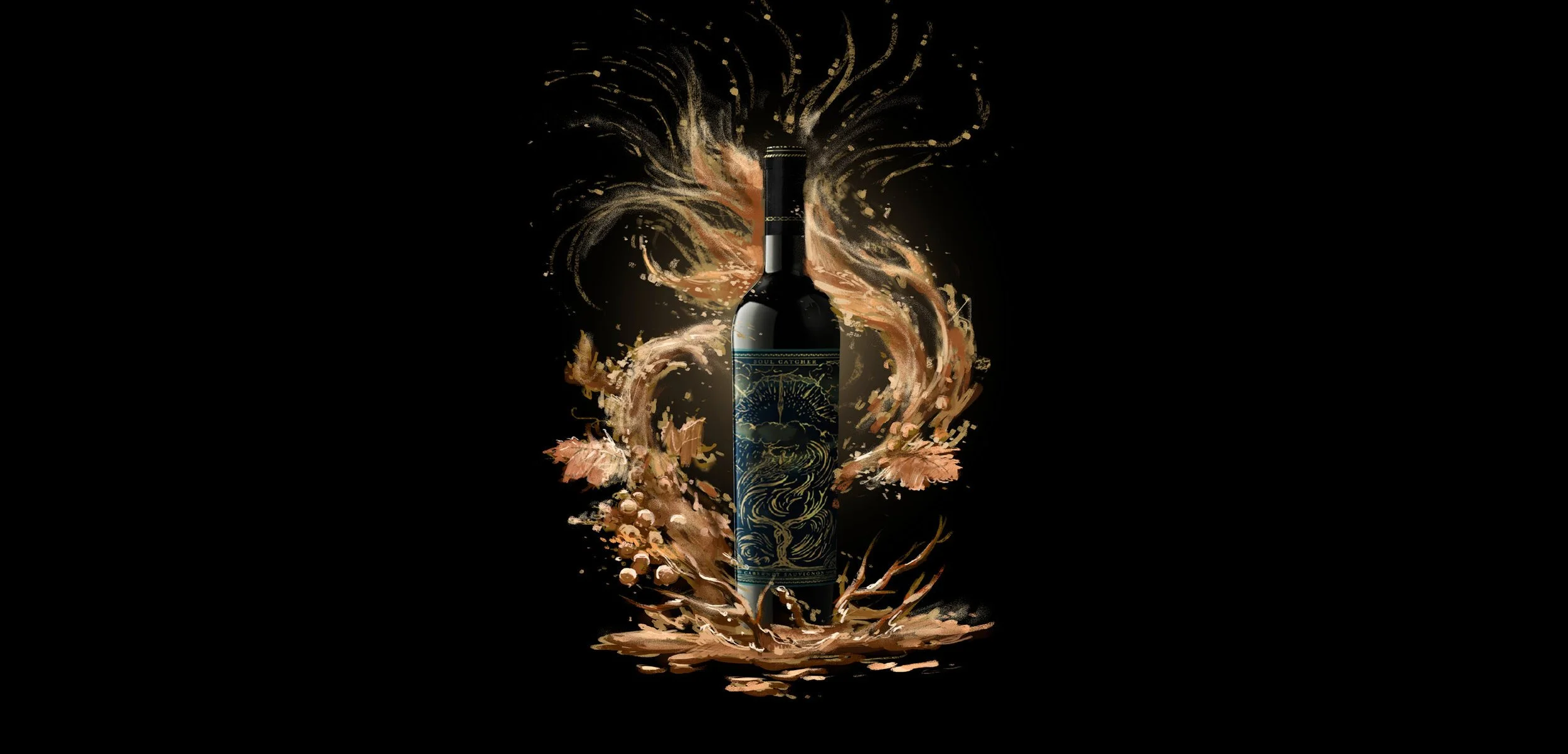 The image is almost entirely CGI, but blends with stock photography for the clouds and lighting. We used classic modelling for the bottle, ground surface, vine and leaves, and created CGI particle and liquid simulations to bring the artwork to life.