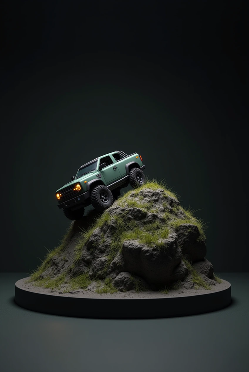 The scene is set in a desolate, low-light studio environment—carefully lit to evoke both realism and abstraction. At first glance, the terrain appears natural, textured with moss and soil, but it's suspended in a void-like space that hints at something artificial. We aimed to strike a balance between a controlled studio setup and a believable off-road setting. The goal was to withhold the full context from the viewer at first sight. As the camera slowly pulls out, it reveals that the terrain isn’t part of a continuous landscape but instead floats and moves—like a treadmill. This gradual reveal reinforces the conceptual twist and draws attention to the car’s ability to conquer rugged terrain in an unexpected, stylized world.