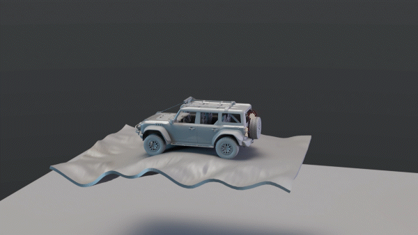 This animation creates the illusion of a vehicle navigating dynamic terrain by animating the ground beneath a mostly stationary car like a topographic treadmill. The stylized world evokes a handcrafted diorama, blending realism with miniature scale. This approach allows full control over the car’s reactions and movements while keeping visual focus on its design and capability. The result is a cinematic showcase of performance in a surreal yet believable environment.