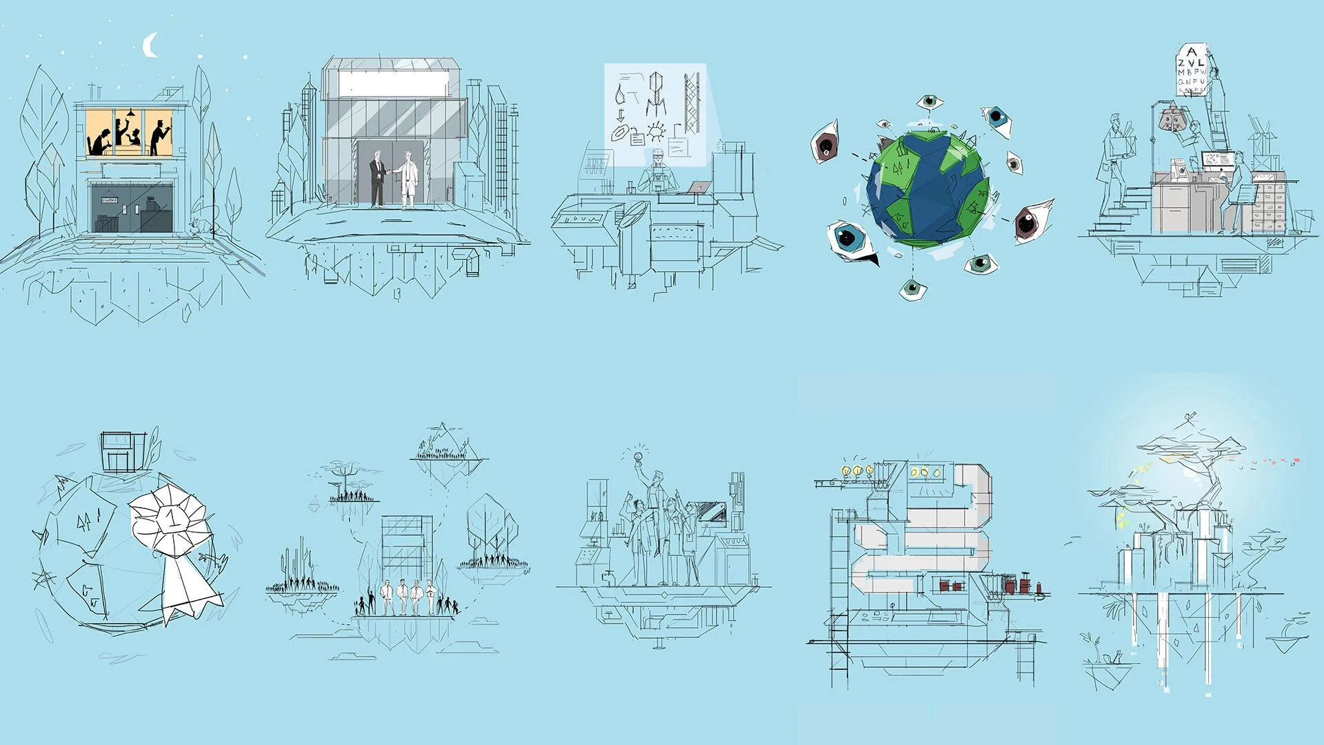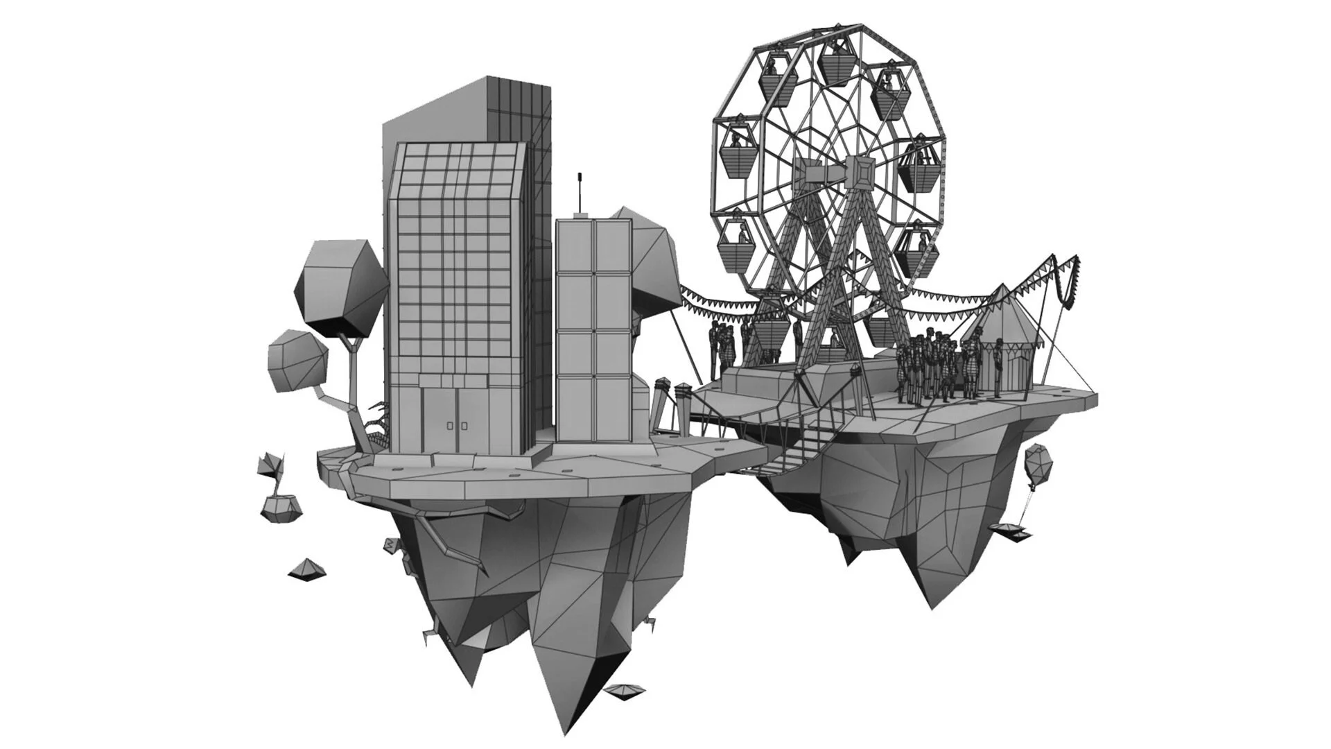 The original illustrations were drawn in a polygonal style, something we were keep to capture in the 3D models. Each world had a strong narrative waiting to be told through animation. We developed a hero island for the final environment. the idea of communities working together was the essence of this, so we worked on the idea of two islands joined in the center. One area that needed to be explored was how the characters would look from different angles. Our concept designed was able to take the poses from the still images and draw front views and profiles to aide our 3D artists.